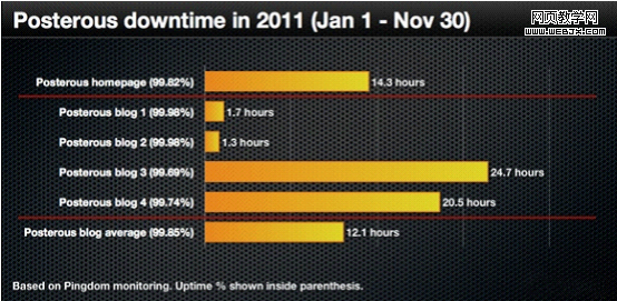 一个为期11个月,2011年1月1日-2011年11月30日,超过一分钟进行一次测试。我们使用Pingdom网站监测服务(当然,这是我们做的),在北美和欧洲多个地点执行测试。