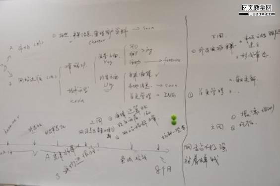 可能是个人思维习惯的原因,每一件事情,我都会在还没有开始做的时候就把这件事情从开始想到结束,分为那几个阶段,每个阶段要做那些事情。所以网站成立之初,我就在白板上画了一张很大的图。上部分是工作组织结构,下部分是发展时间轴。右侧是当时那周的工作安排。