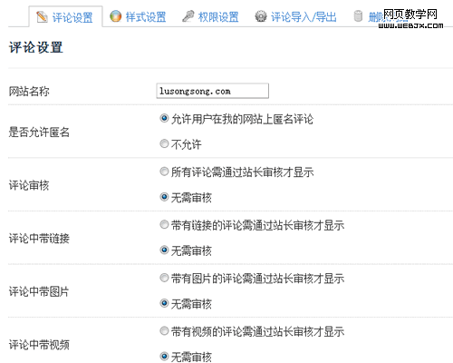 从上图中我们可以看到,评论啦提供了评论的基本信息设置、评论样式、权限设置、评论导入/导出功能,还可以调用最新评论、热门评论,但对于是否绑定 什么社会化网站,这由不得用户确定,系统都是设置好的,现在默认有QQ、人人网和新浪微博。同时普通用户很难把列表中别人的评论分享到微博上,只能在评论 时分享。