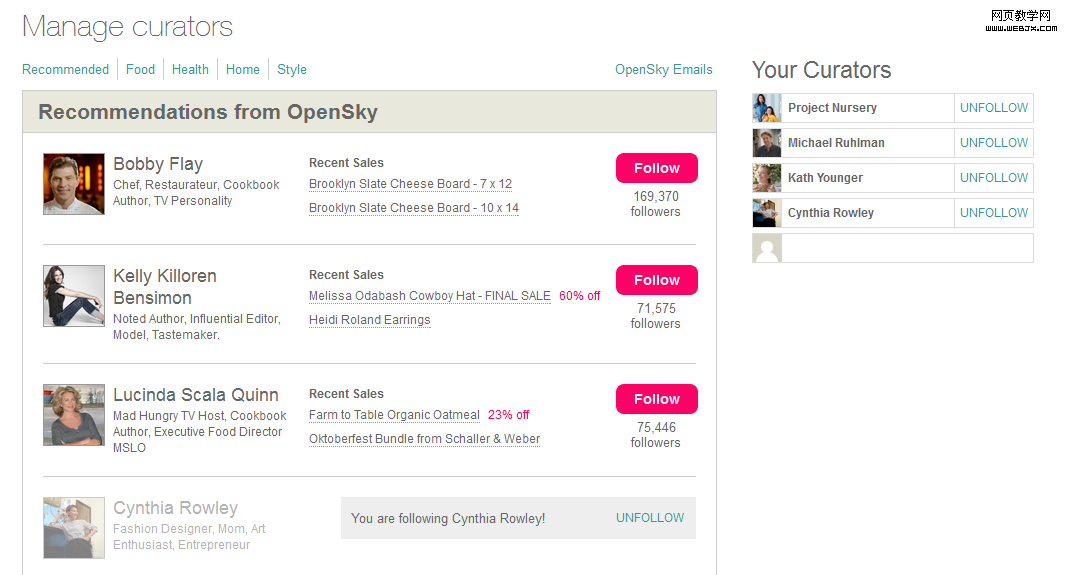 观察上图,你就能明白“Twitter式的购物指导”的含义。就像大家使用微博一样,我们会关注一些个人感兴趣的热门用户。在OpenSky上 也是相同的道理,用户可以从一份60人左右的购物达人推荐列表中跟随那些感兴趣的人。这些购物达人多为时尚、健康、传媒等行业的知名人物。跟随这些购物达 人后,用户可以看见他们推荐的商品和附注的购买理由。随后,用户就可以根据购物达人的建议在OpenSky上挑选所需的商品了。