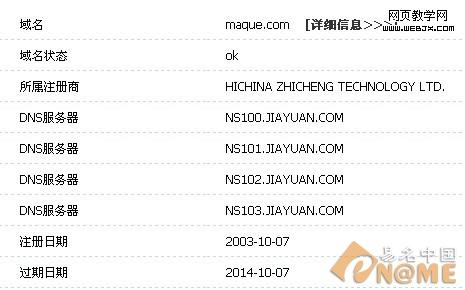 Whois信息得知,maque.com域名DNS服务器显示为jiayuan.com,所有者信息为世纪佳缘yu fuping,该域名注册于2003年10月,至今已有8年时间,麻雀其他后缀域名maque.cn/.com.cn/.net/.org等均已被注册,这些域名多为域名爱好者持有。