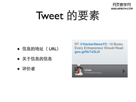 Twitter 上,URL 和关于信息的信息都不是必需的:你可以只发一个笑脸给大家。但是,目前的统计表明,有短链接的推更容易获得转发。长期 Blog 的推广经验也证明,“关于信息的信息”写的如何,也很重要。最后,评价者也是有效判断一个信息的数据。 HackerNewsYC 在互联网创业相关内容上的信誉不用多说。