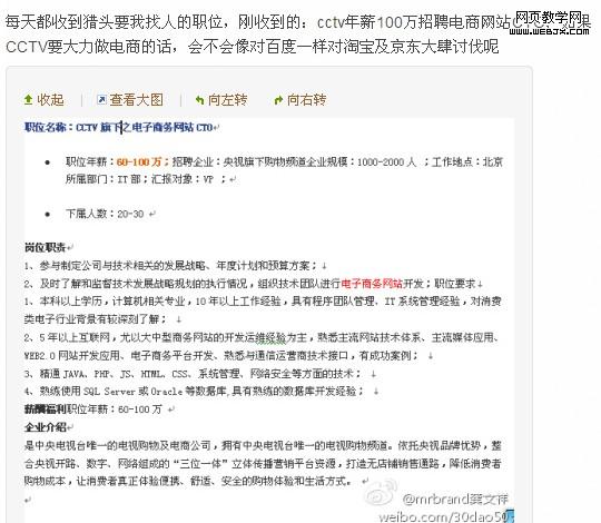 CCTV旗下购物频道开出年薪100万招电商CTO