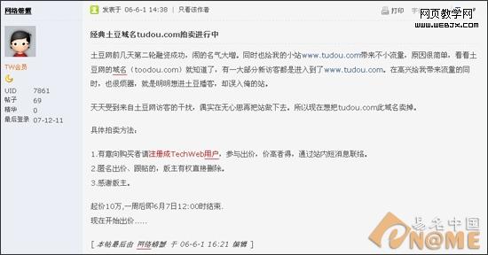 在帖中“网络螃蟹”表示,因其网站tudou.com受土豆网toodou.com影响,他的小站tudou.com带来不小流量,在高兴带来流量的同时,也很烦恼,经常受到来自土豆网访客的干扰,无心思再把站做下去,才想把tudou.com此域名卖掉,域名起价10万元,价高者得。