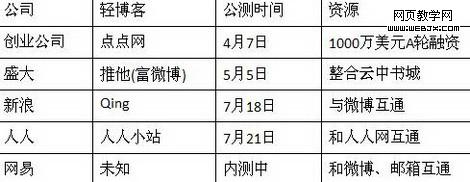 历数国内的轻博客,点点网于4月7日公测,公测不久,宣布获得联创策源、红杉资本和创新工场超1000万美元A轮融。截止7月份,点点网用户200万。5月5日,盛大微博推他公测,整合了盛大的游戏、文学资源。7月18日,新浪轻微博Qing启动公测,与新浪微博互通,最新数据显示,新浪微博用户已经超过百万。7月21日,人人宣布轻博客产品“人人小站”对外公测,并与人人网1.2亿用户打通。