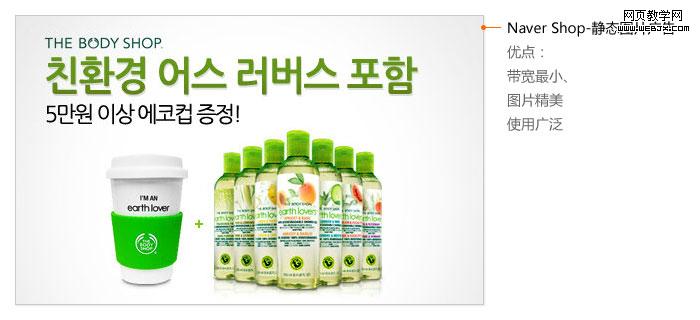 这是Naver shop中的一个商品展示的静态图片banner,banner中大大的绿色标题,与精美的图片相映衬,既能突出文字的表意,也可以将视觉停留在精美的图片之上。
