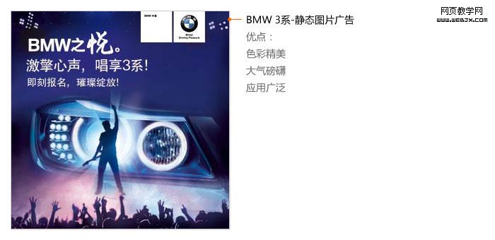 宝马3系的banner广告,放大的经典的宝马车灯,一眼就能认出,这就是宝马,依然是那么大气,结合音乐活动,体现出这次活动的主题——BMW之悦。