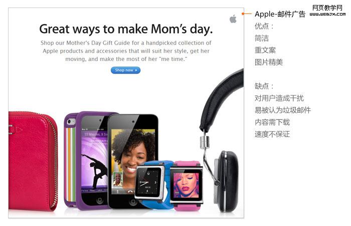 苹果的邮件广告,主题突出,一句话即说明这次活动的主旨:为母亲节挑选礼物。通过各种女性形象传达着“母亲节”的主题。
