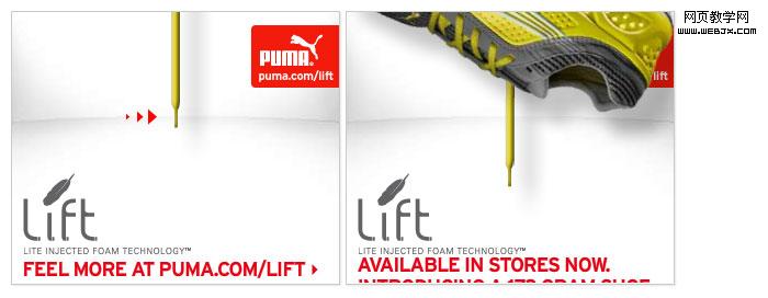 PUMA互动广告——画面上有一根鞋带提醒你去拖拽,使用鼠标拖拽的时候,会拽出一双运动鞋,形象的说明了,puma的运动鞋是如此得轻薄。