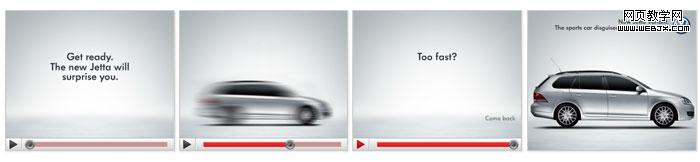 大众广告——整个广告以视频播放为创意,点击播放后一路快速驶过的大众汽车,快到浏览者根本无法看到车是什么样子,吸引用户拖拽进度条自己回放观看。