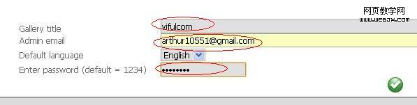 第十五步:点击后面的上面的勾勾,进行对相册的相关操作!在新点开的框框里面输入相册的名称、你的邮箱、语言(如果你下载的MG2是中文版的可以选中文)、密码。