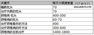 从关键字的情况来看,有睡眠枕头直接需求者,这些需求者可以有效的转化为销售客户;也有潜在的需求者,也就是一些寻求颈椎病的治疗和预防的方法,这些潜在客户也能转为了直接的销售客户,以前只是列举了部分的关键字情况,除了这些关键字外,还有大量的和睡眠枕头,颈椎病相关的关键字。从搜索量情况,可以看出市场需求还是比较大的。