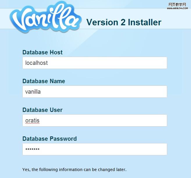 Vanilla的安装界面非常简洁,也非常简单,只需建立一个数据库,之后把标准信息填进去就好。