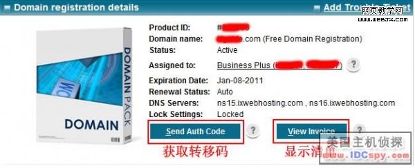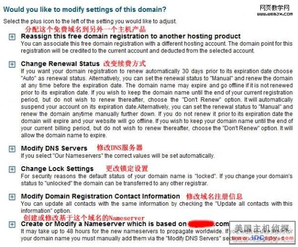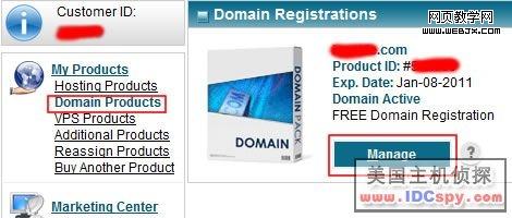 二、点击上图中左边的domain products,右边对应出现域名的产品,点击manage按钮进入其管理页面,如下图: