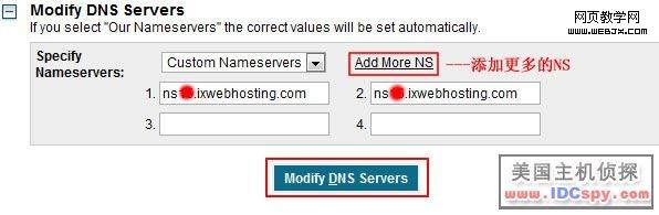 注意:如果需要更改为其的的NS服务器,那么只需要将1和2后面的更改为所需,即可如果一组服务器还不够的话,你可以添加上面的“Add More NS”,来添加一组,就会出现下面的3和4。