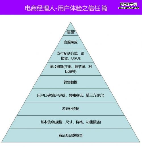 说到用户体验,关注电商及互联网十来年,给我最深的体会就是信任是最关键的。试想一个电商平台如果不能给你最起码的信任感觉,你会下单掏钱买东西吗?我想99.9%的网民都会选择无情地关闭浏览器,寻找下一个能够让你产生信任的目标商家。所以我认为电子商务的用户体验,所有的细节工作一切都要为了给客户建立起信任感而开展,不能树立信任感觉,所有做的用户体验方面的工作都是没有任何意义的。信任的基本要素为:诚实、动机、能力、结果。