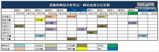 推广活动排期表主要用来记录网站的营销活动。这是网站中比较频繁的一类事件,并且每次都会造成网站流量和指标的大幅度变化。同时也是我们每次都需要分析的一块内容。尽早的了解这部分流量的变化非常重要。获得营销活动事件最好的方法就是每个月向市场或推广部门索取一份排期表。并且要求他们将排期变化及时更新给你。然后,我们将排期中的内容更新到我们的流量日记中就可以了。