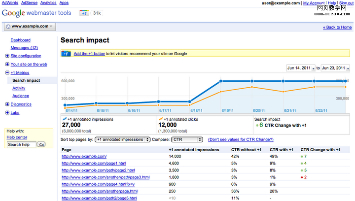 首先,谷歌网站站长工具中的+1指标将向您展示+1按钮如何影响着您网页今后的流量: