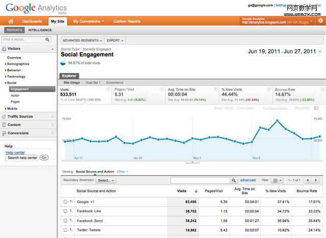 最后,通过Google Analytics中的社交插件跟踪功能,您还可以看到,用户是如何使用除+1之外的其他按钮来共享您的内容的。一旦您为Analytics配置了JavaScript,社交参与报告会帮您比较在您的网页上发生的各种类型的共享活动。