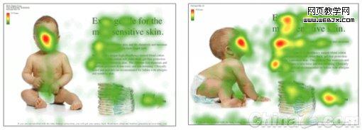 如上气象图对比所示,婴儿的朝向潜在地影响了大众的目光所向,右图中的婴儿使访客不自觉跟随其目光注意到右侧的文字。