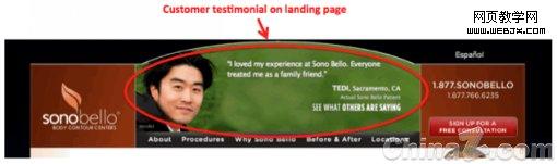3)推荐—另一个非常有效的策略是在你的着陆页上展示用户的推荐和好评。没有比建立与潜在客户之间的信任更好的方法了。此外,尽管你不一定要像Sono Bello Body Contouring那样展示在你的在网站顶部,但你应该在着陆页上的某个地方—可能是侧栏上展示出来。