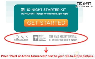 4)提高访客的信任度—这个着陆页优化的清单不能少了Bryan Eisenberg(首批真正的转换率大师之一)的建议。Bryan Eisenberg曾在他的著作《Always be Testing 》里强调,最好的技巧是把信任图标安置在号召性动作图标旁边,这会使更多人因此而提高对访问行为的信任度,而去点击它们。Provent Therapy在它们有关治疗睡眠呼吸暂停的着陆页所做的便是众多遵循此原则例子中的一个。