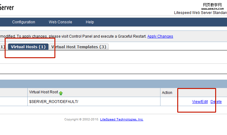 3.Litespeed安装后会默认配置一个虚拟主机,我们要开启单独虚拟主机.htaccess功能。如果您添加了好多个虚拟主机,也可以单独设置: