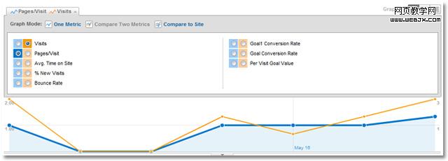 Google Analytics的许多报告,都包含了呈现选定时段资料的线性图表,只要将滑鼠移过线上的点,就能看到该时间点的资料,也可点击左上的标签,来改变你想要视觉化的指标,还可选择比较两个指标,当没有比较不同时段时,则是可以和网站平均值比较,比较模式中会出现第二条灰线。