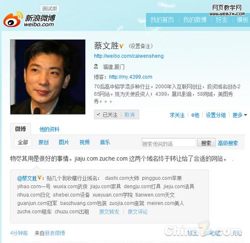 蔡文胜微博证实jiaju.com百万出手新浪