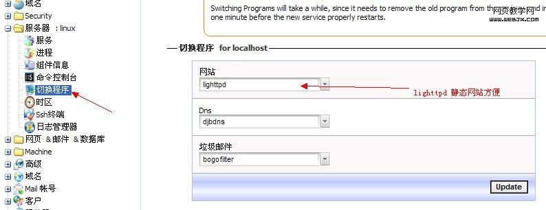 图11 VPS程序切换,看个人喜好。lighttpd 这个网站界面里自带有伪静态功能,很方便,推荐使用
