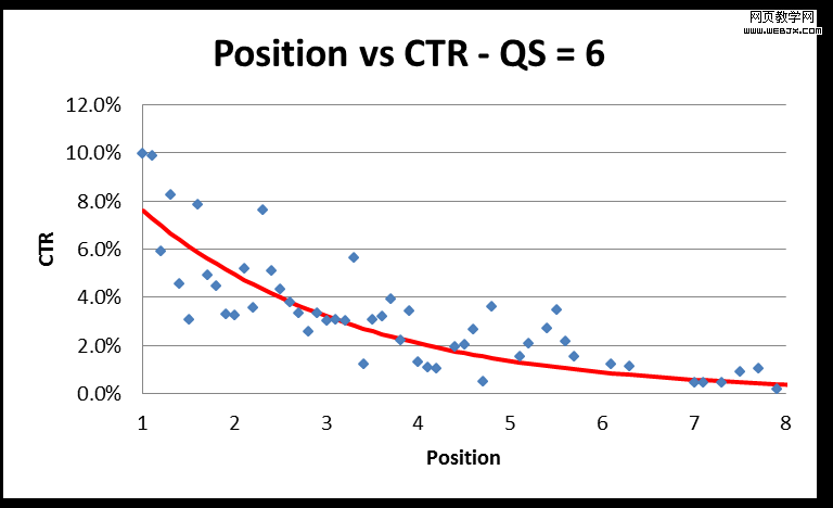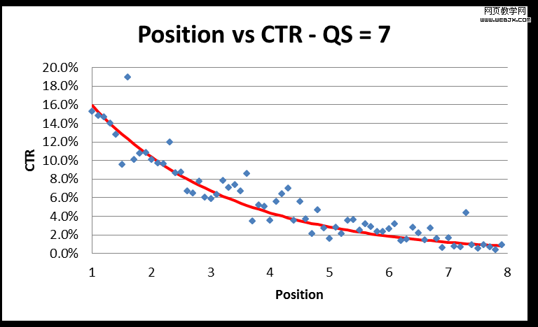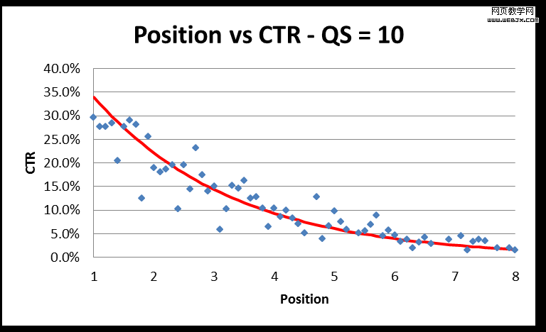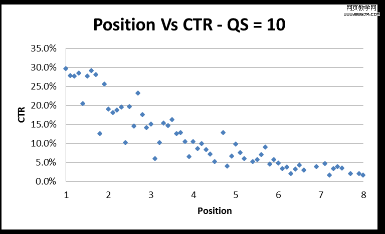 我观察了从位置1到8的平均点击率(递增为0.1),得出每个关键词的质量分。通过图表数据显示,不难发现一种模式。下面为质量分为10的关键词位置与点击率的统计图表: