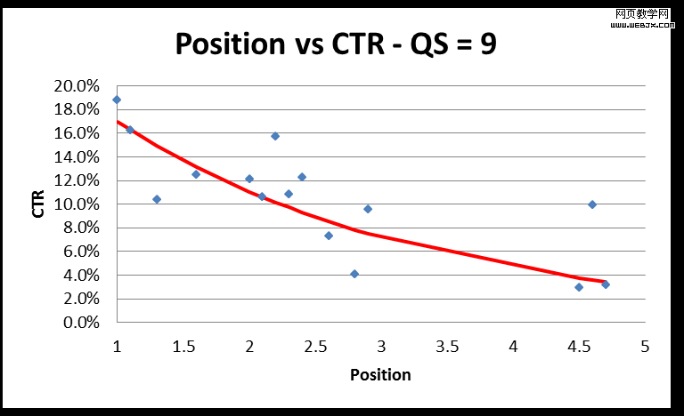从上面的图形得出,google根据什么样的点击率来给出你的质量分为10。通过数据拟合曲线,迹象有可能预示着你应该做点什么来让质量分达到10: