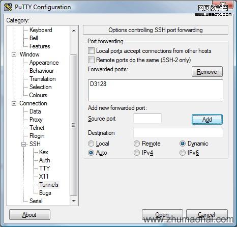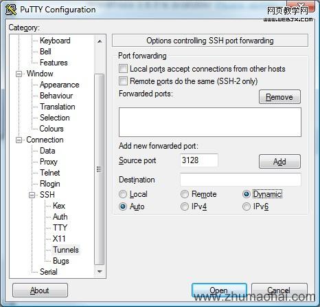 打开putty,到Connection-》SSH-》Tunnels,填入Source port:3128,选择Dynamic,并点击add。