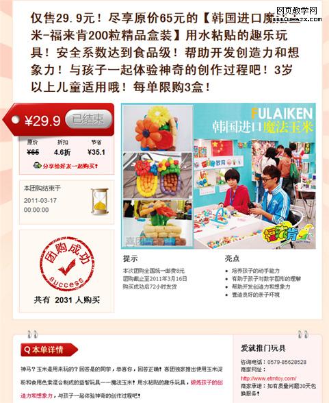 3月10日-12日,我们与国内一线的*团(为避免广告嫌疑,本文均以*代替原团购网站名)合作了一款魔法玉米的团购,因效果好延续到了3月16日,总计团购数量略超2000个,是继聚划算后又一次成功的团购,从数据的细节来看,我们认为团购是值得做的。