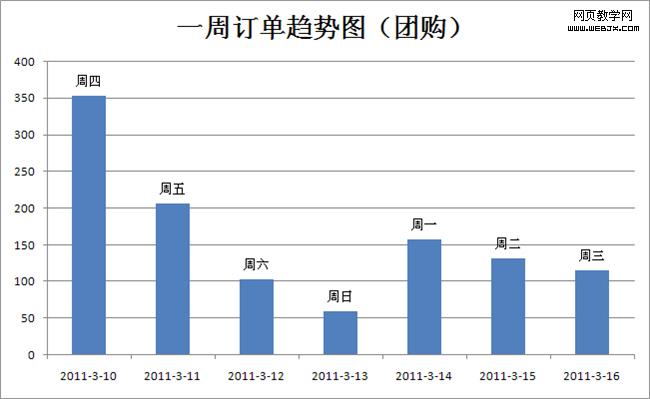 从我们这一次上线一周时间的实物团购来看,订单的增长比较稳定,其中第3月10日(周四)因为是第一天上线,有比较好的位置和外部流量导入(比如tuan.hao123团购导航首页推荐),整体的订单量相较其他6天高出很多;从数据来看,在正常情况下,每日订单稍有递减,周六周日相对订单较少,由此可以看出,什么时候上团效果好,也是需要具体分析的(排期很重要)。