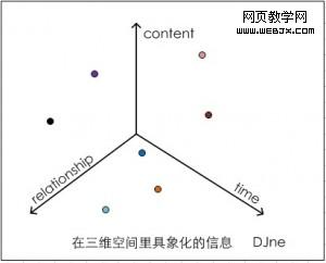 这里将信息的三个属性填在立体几何中的三维(X,Y,Z)中,也就是说,不同的time,relationship和content都可以代表空间的一个点,这个点就代表了一个具象化的信息
