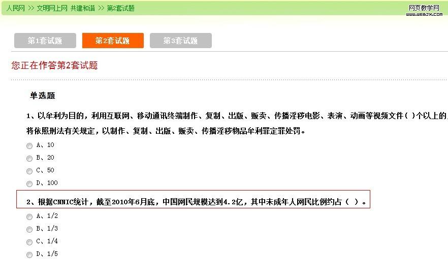 4、当仔细分析这个关键词排名第一的内容的时候,一切答案都出来了,原来是:“文明上网,共建和谐”网上征文和知识竞赛 的第二套试题里第二个选择题,如图: