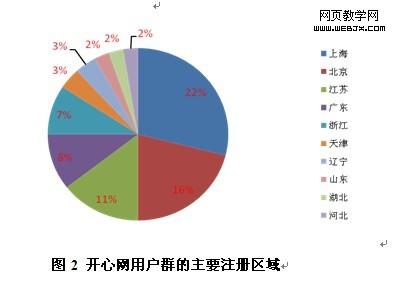 统计显示,开心网注册用户群的年龄大多在19~30岁之间,注册区域最多的为上海、北京、江苏、广东等经济发达的省市(见图1,图2)。其中高学历者(大专以上)占到81%,中高收入者(月收入4000元以上)占到64%。总的来说,开心网的注册用户群大多是年轻的、大城市的、有文化、有消费能力的白领。这部分人群工作压力较大,闲暇时间较少,因此希望在工作之余,能够以一种简单、快速、轻松的方法获取新闻信息。