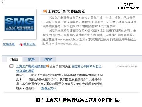 2009年7月22日,上海文广与开心网合作直播日全食。直播过程中,不仅直播信号频频出现问题,主持人的过分热情与嘉宾的过分冷静也形成了鲜明对比。开心网用户纷纷发帖表示不满,还有用户总结了演播室的各种经典对话,批评主持人与嘉宾的状态完全是“冰火两重天”。上海文广随后在开心网上发帖作出回应,当天的嘉宾江晓原本人也进行了解释(见图3)。