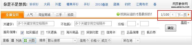 同样在淘宝商品搜索结果页的上方,展示产品的地方,出现了简易的上一页和下一页的翻页方式,我想这是很多站长都没有在网站运用到的。这个地方存在的主要价值是很多人想躲避开第一页大家的广告结果以及满足用户二次访问直接进入到搜索结果第2页,而直接进入商家页的方式之一,虽然使用量来说的确不是很大,但是他满足了部分二次访问用户的需求。
