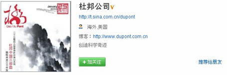 Charlie:这是杜邦公司的头像和简介,头像选用了中国的水墨山水,有点意思,很入乡随俗,套近乎的感觉。简介使用了公司理念,虽然简洁,但还是有点缺少个性化因素,很大公司的架子。在社会化媒体,简介里最好放下架子,提示这里是交流互动的地方比较好吧。