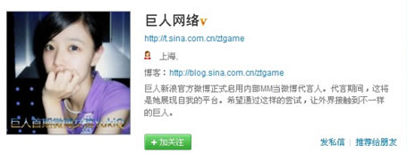 Charlie:巨人网络比较有意思,头像直接是形象代言人。简介也比较有新意,比较符合社会化媒体的属性,以个性化人物来代替官方形象与客户打交道,利于建立关系,利于进行沟通。虽然不是推荐企业都使用美女来吸引眼球,但以一个相对个人的身份,而不是官方的身份来进行社会化媒体营销,巨人已经先走了一步。巨人的营销历来以俗见长,这次也没例外。