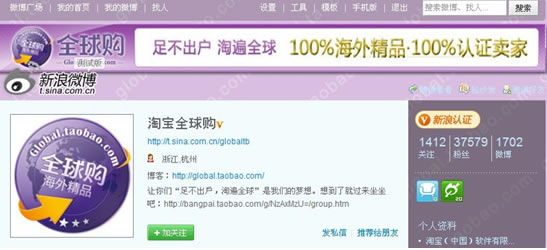 Charlie:背景图片,是企业唯一可以自己定制的部分。从我的观察看,大多数企业,还都没有进行利用,所以,也没看到很好的例子。这是淘宝全球购,上面的广告部分,就是通过背景加入的。这个广告的内容,不符合围脖的氛围。