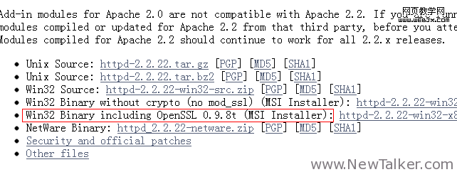 1.1Apache下载,官方地址(http://httpd.apache.org/),此处笔者下载版本的是Apache HTTP Server 2.2.22,使用的是OpenSSL的版本(httpd-2.2.22-win32-x86-openssl-0.9.8t.msi),如图
