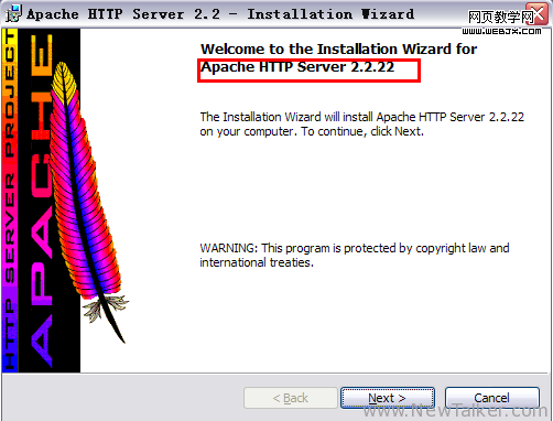 2.1运行下载好的“httpd-2.2.22-win32-x86-openssl-0.9.8t.msi”文件,出现如下安装界面,如图