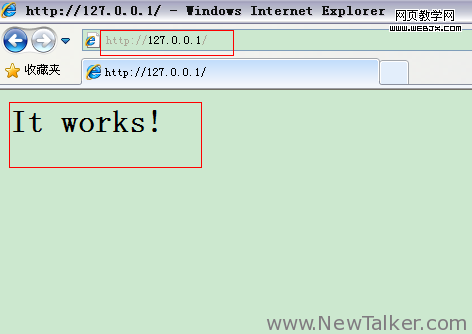 此时,我们可以在浏览器地址栏中输入http://127.0.0.1访问,浏览器显示文字“It Works!”,表示服务状态正常。