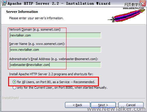 这里是要填写服务的相关信息,Network Domain这一项是填写你的域名(如:xxx.com);Server Name这一项填写你的服务器名称(如:www.xxx.com);Administrator’s Email Address这一项填管理员的邮箱地址;在本地配置,以上三个栏目均可以随意填写,有效无效都可以。下面2个选项,第一个是为系统所有的用户安装,使用80端口;第二是只为当前用户安装,使用8080端口;一般情况我们默认第一个,然后点击“Next”;