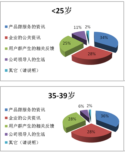 正在兴起的微型博客(即微博)已经广为受众所接受,但调查结果显示:35岁以上的成熟经理人对微博的喜爱多过35岁以下的年轻经理人。微博的发展虽然还处在起步阶段,成熟的经理人已认识到微博的发展潜力,并以行动实践着其观点。35岁以下的年轻经理人对社交网站的喜爱多过35岁以上的成熟经理人。可见以35岁为分水岭,年轻经理人更热衷于社交网站,而成熟经理人则更青睐于微博。