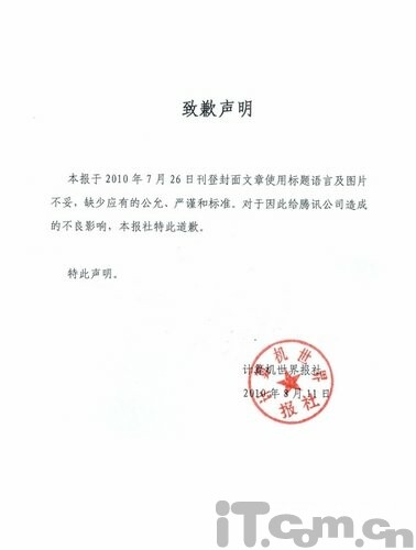 本报于2010年7月26日刊登封面文章,使用标题语言及图片不妥,缺少应有的公允、严谨和标准。对于因此给腾讯公司造成的不良影响,本报社特此道歉。