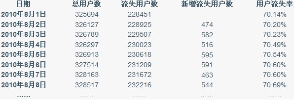 首先需要明确的是用户的流失可能并不是永久的,也许用户在一段时间内对网站确实没有任何需求,那么他会远离网站一段比较长的时间;或者流失用户也会因为网站的某次营销或者网站质量的改善而重新回来。网站总的流失用户数的计算比较简单,以超过1个月内登录即为流失为例,那么总流失用户数就是所有“当前时间点-用户最近一次时间点》1个月”的用户数量。但是单纯的总流失用户数量对于分析是没有意义的,因为大部分情况下这个数值是一直递增的,我们需要计算总流失用户数占总用户数的比例及新增流失用户数,观察它们的变化趋势,如下表: